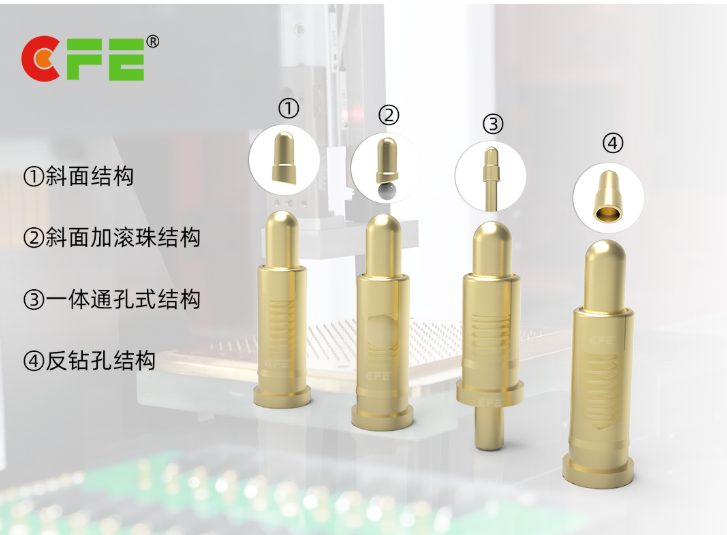 一、pogopin斜面结构:为保证针轴在工作时100%与针管接触,我们把针轴与弹簧接触的一端切成斜面,这样的设计可以保证稳定的低阻抗,确保针轴与针管紧密接触。
