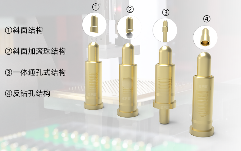 弹簧针的内部结构设计关乎着弹簧针的机械性能和电气性能、环境性能等方面,针头是弹簧针的核心部件之一常见的设计方案有斜面结构、斜面加滚珠、一体通孔式结构和反钻孔结构。
