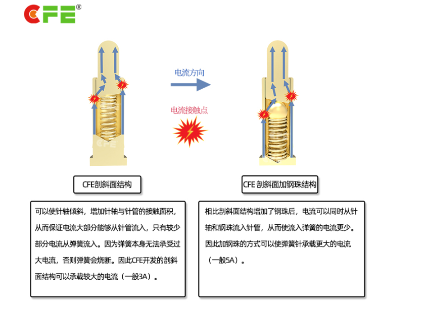 弹簧针pogopin剖斜面加钢珠结构相比剖斜面结构增加了钢珠后,通过pogopin内的电流可以同时从针轴和钢珠流入针管,从而使流入弹簧的电流更少。因此pogopin剖斜面加钢珠的方式可以使弹簧针承载更大的电流(-般5A)。