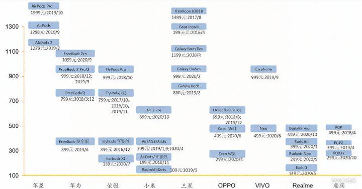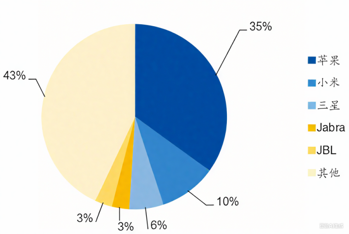 从品牌分布来看,TWS耳机市场是由苹果公司率先引爆,经过数年发展,其产品AirPods在中高端市场具有极高市占率。来自Counterpoint的分析数据,截至2020年第二季度,位居TWS市场前三的企业分别为苹果(35%)、小米(10%)以及三星(6%),小米凭借价格优势主要覆盖中低端市场。