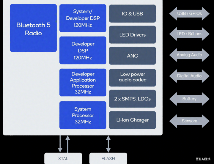 高通QCC5124片上系统(SoC)旨在满足小型设备对强劲、高质量、无线蓝牙监听体验的需求,低功耗可实现更长时间的音频播放。QCC5124体系结构专为低功耗的高性能而设计。与其之前的技术相比,功耗可以降低高达65%,可以在几乎所有操作模式下支持更长时间的音频播放。