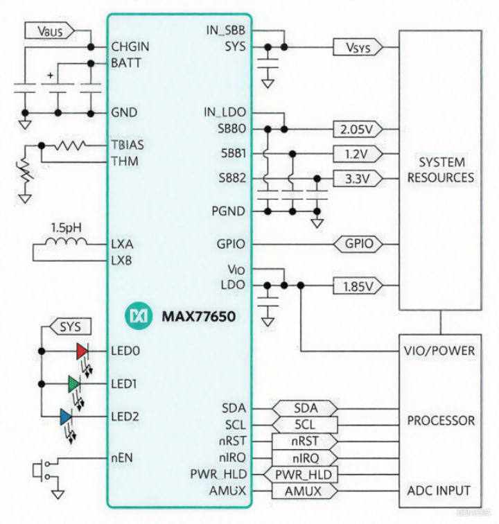 此外,150mA LDO为音频以及噪声敏感应用提供了纹波抑制。高度可配置的线性充电器支持各种锂电池容量,并包括电池温度监控以提高安全性(JEITA)。MAX77650/MAX77651中的模拟多路复用器能将多个内部电压和电流信号切换到外部节点,以便使用外部ADC进行监控。双向I2C接口可供配置和检查设备的工作状态。