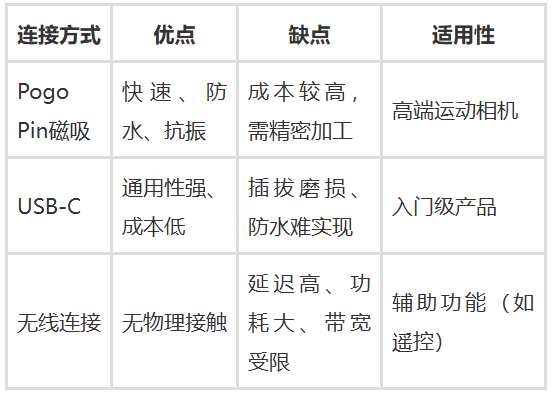 ● 外接配件扩展:连接麦克风、补光灯、GPS模块等,避免线缆缠绕。例如GoPro部分配件:通过磁吸+Pogo Pin连接外接显示屏或麦克风。